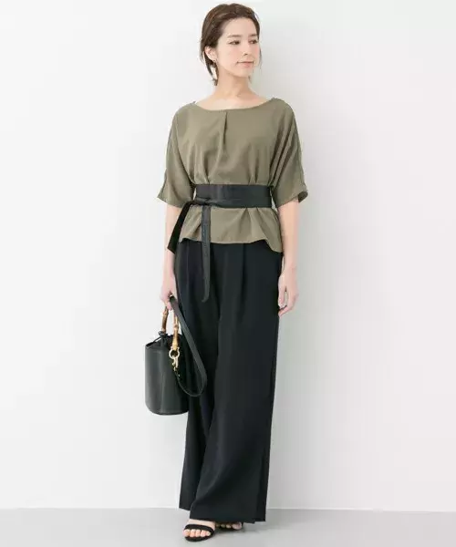 金子三記 Miki Journal Standardのシャツ ブラウスを使ったコーディネート カーキ ワイドパンツ 着こなしいろいろ ワイドパンツ コーデ 夏